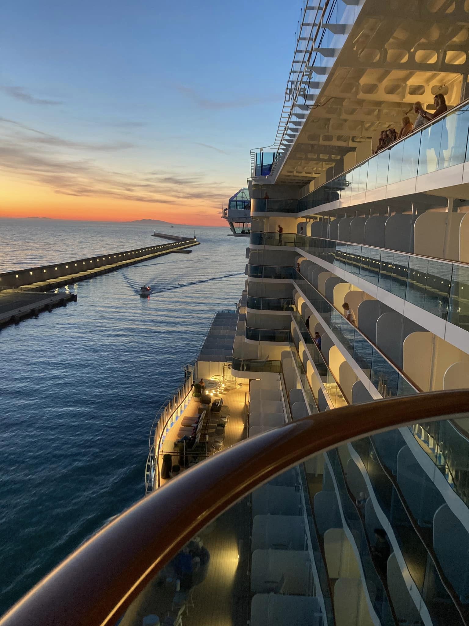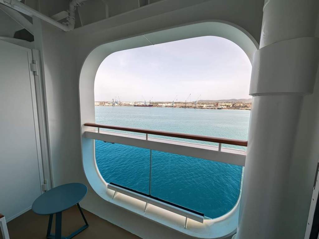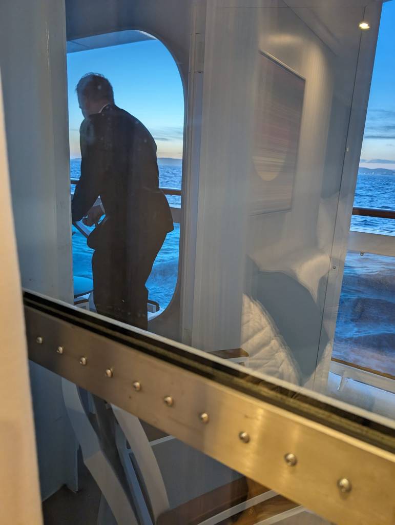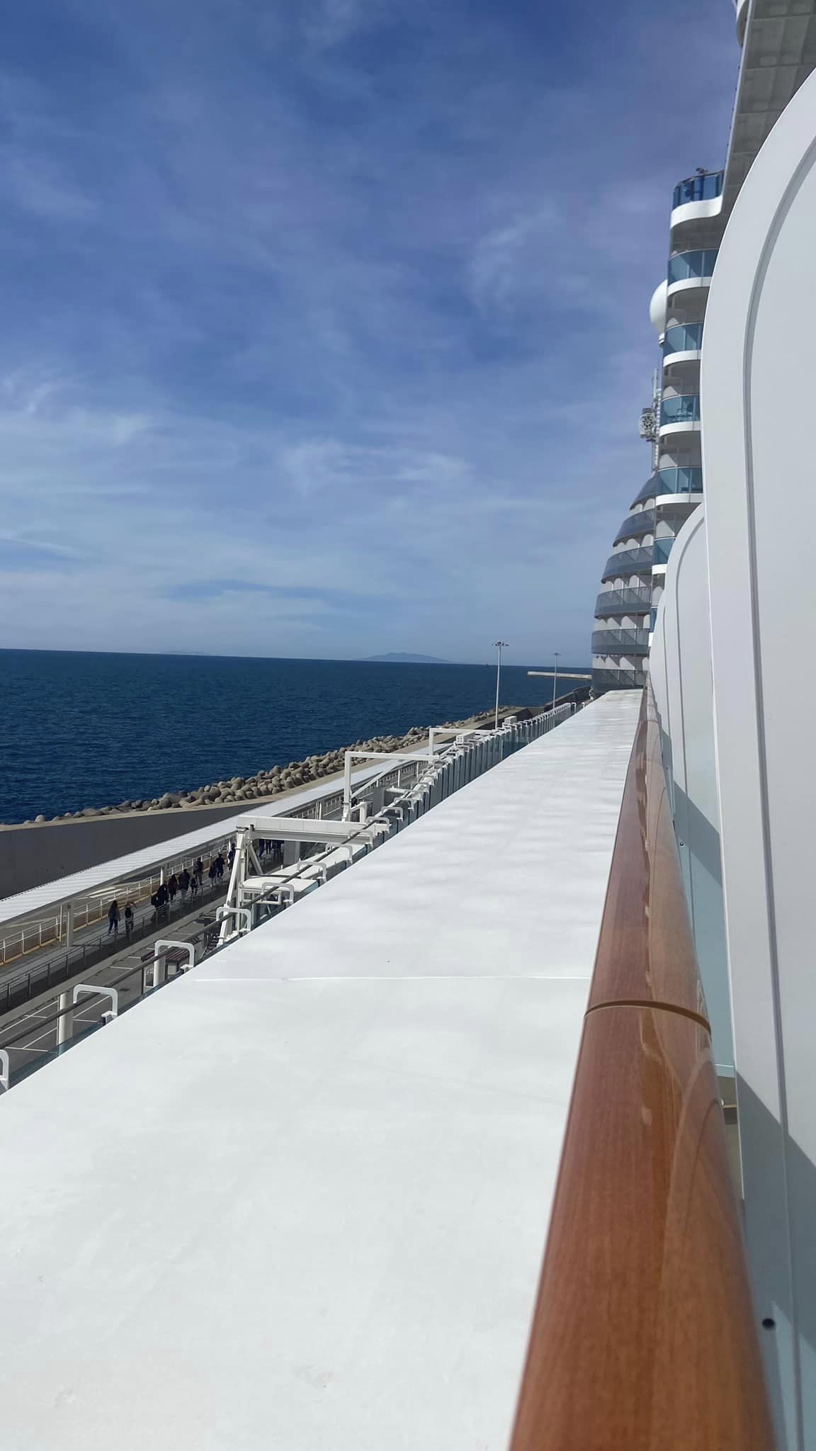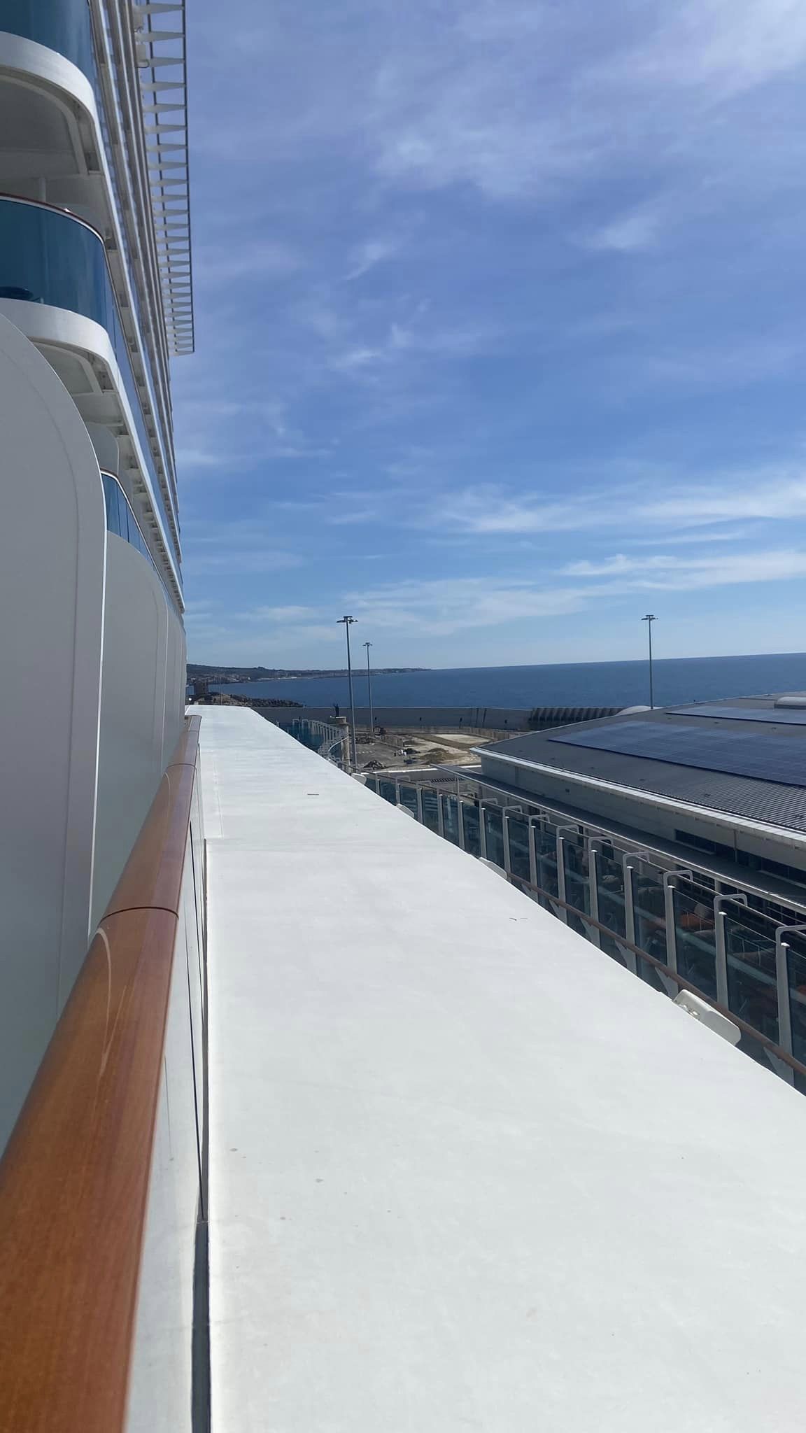 And a reel showing the penthouse suite which has a corner of its balcony facing aft.