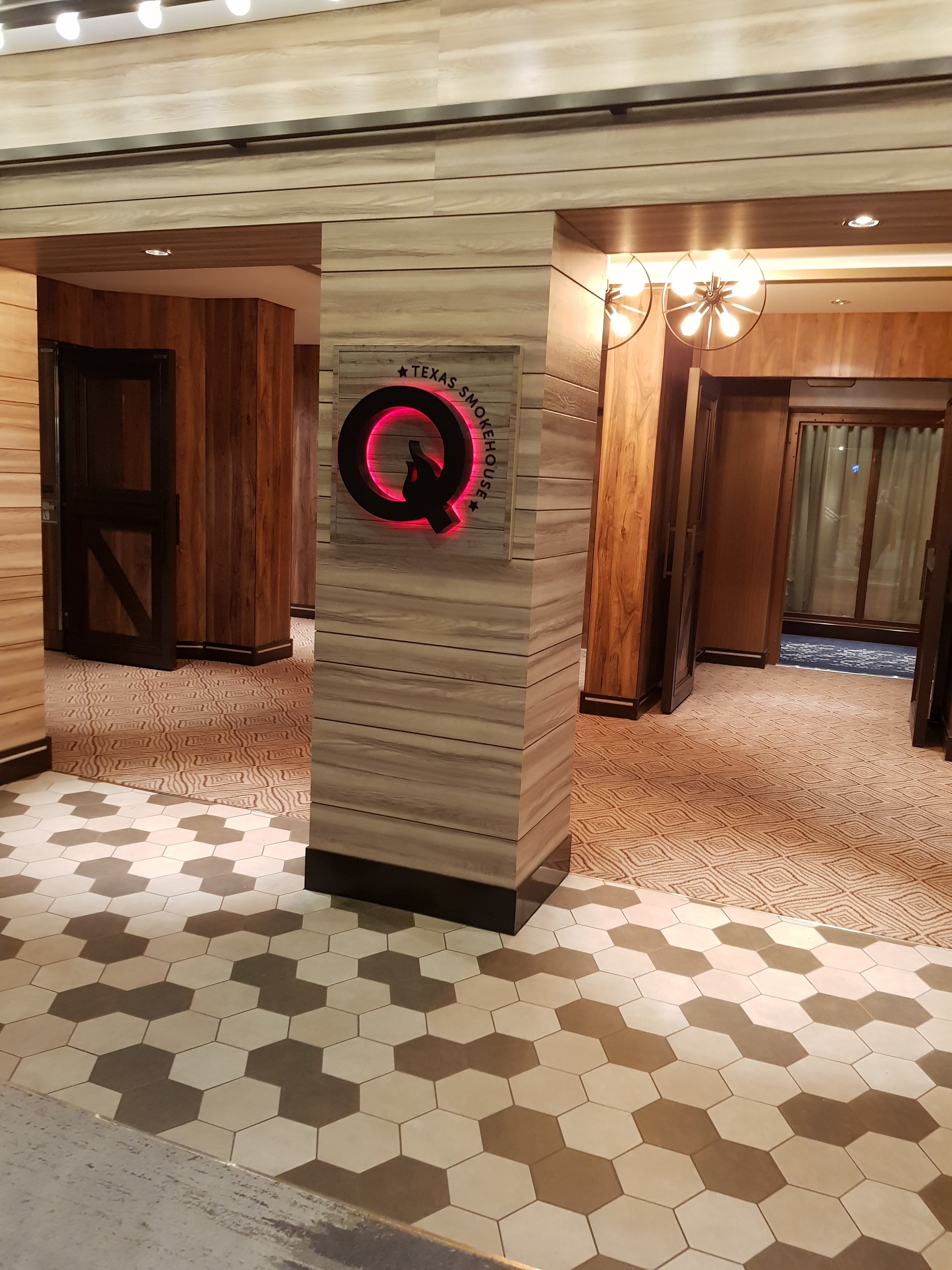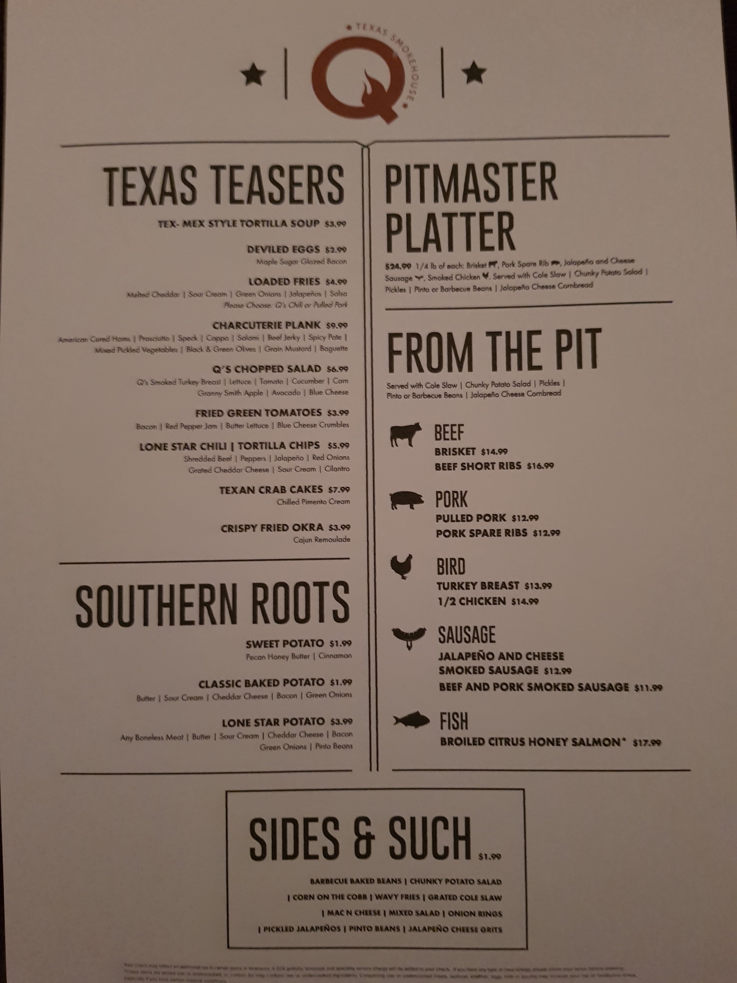 We had booked into Q Texas Smokehouse BBQ for 6:30. It was pretty quiet – lots of seating, attentive waitstaff, and a stage for live country music later.