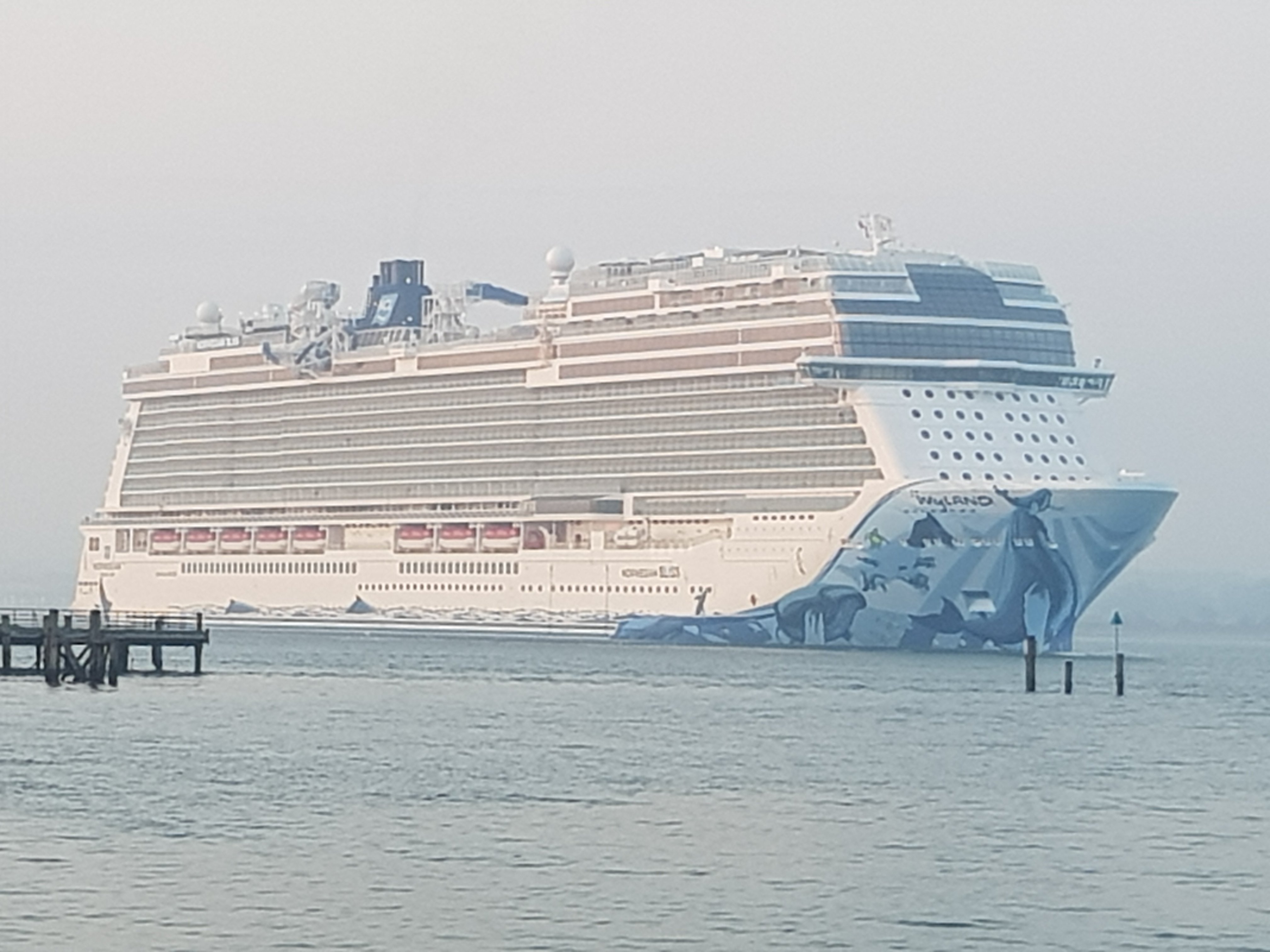 We sat through Muster Drill in La Cucina and headed up to the Observation Lounge for sailaway. It had been dull and overcast all day but the sun suddenly appeared! Wonderful to see the reflection through the floor to ceiling windows and feel the warmth!