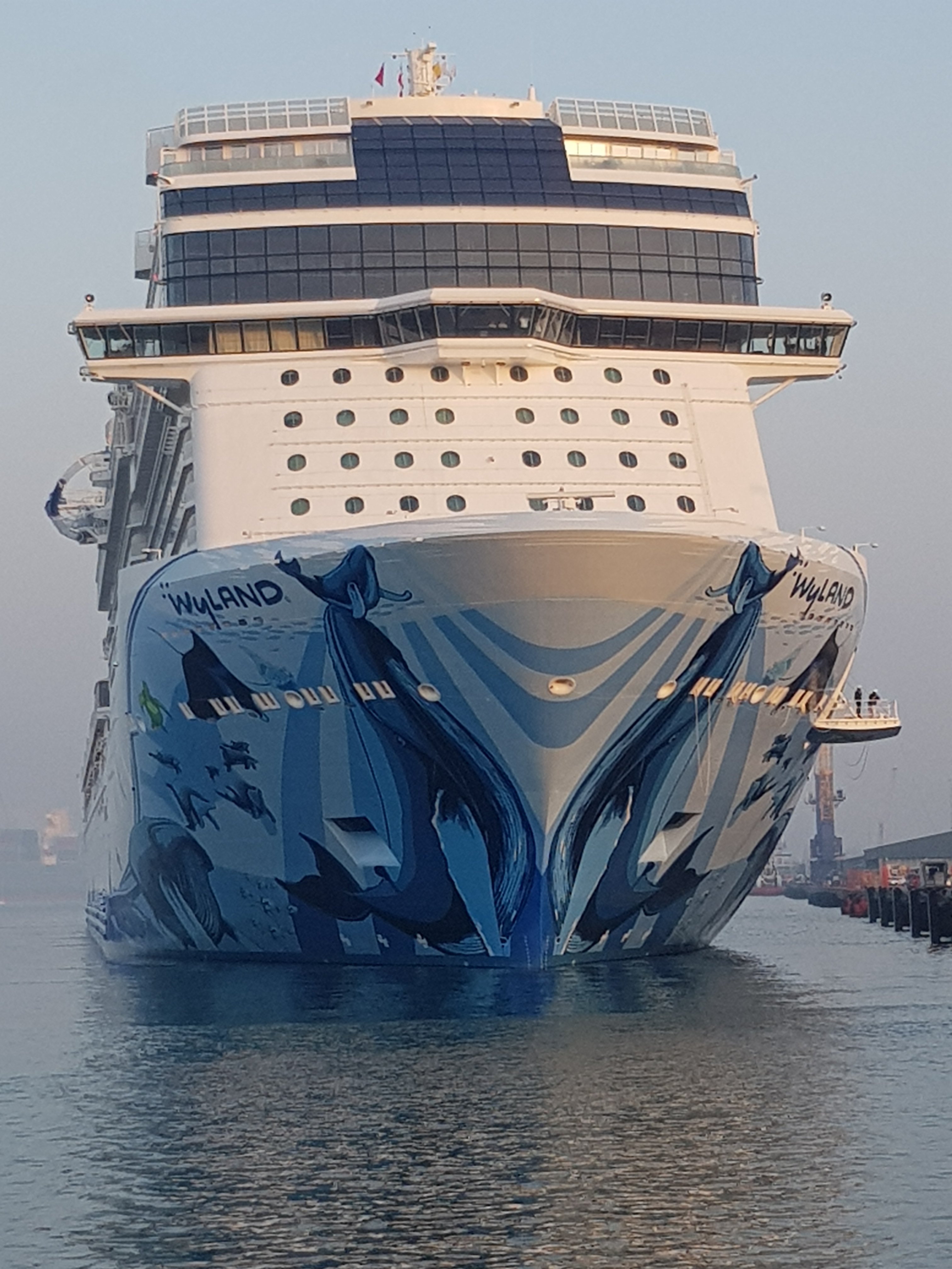Norwegian Bliss arriving in Southampton at sunrise on 21st April 2018.