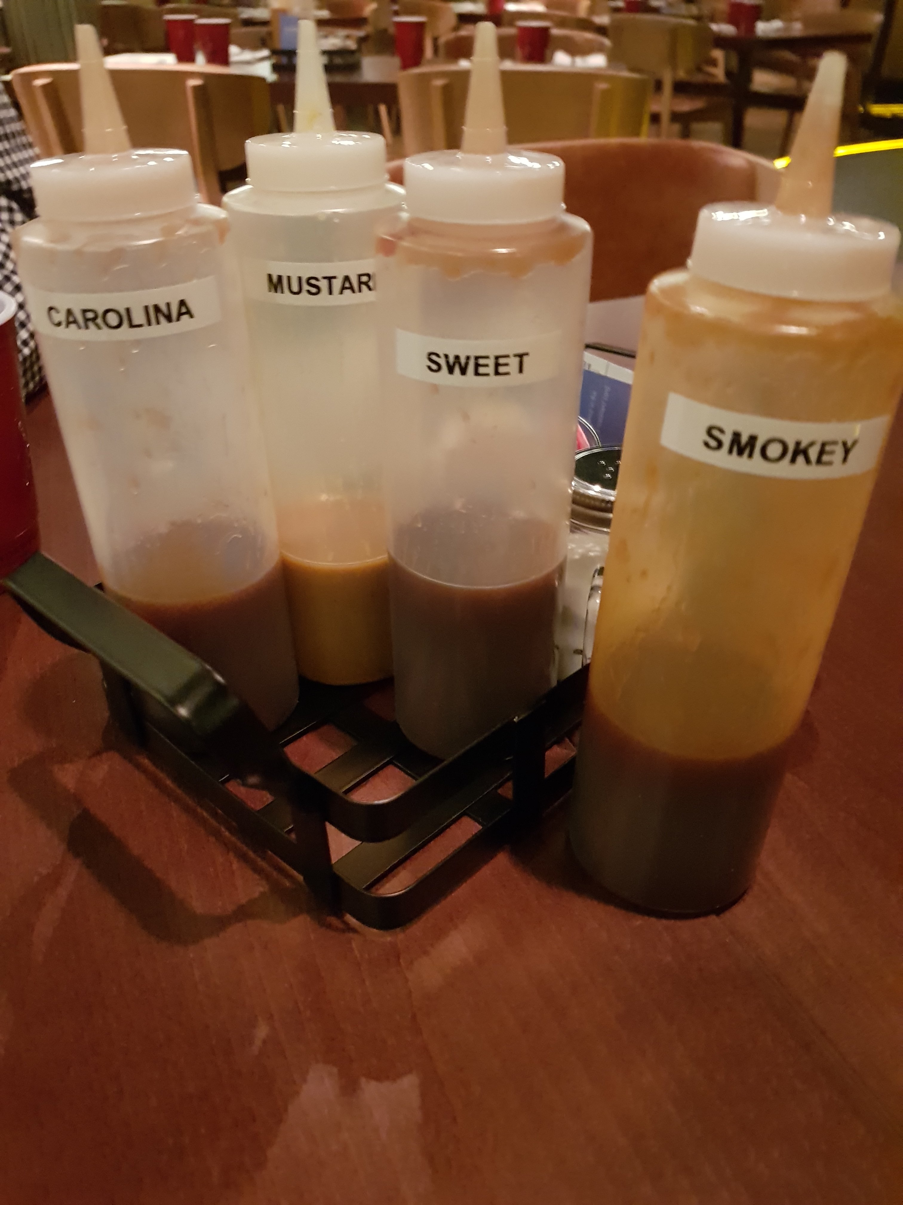 We were new to Texas BBQ and the fact that the meat is prepared as dry rub. There were 4 types of sauces you could add to your dish.