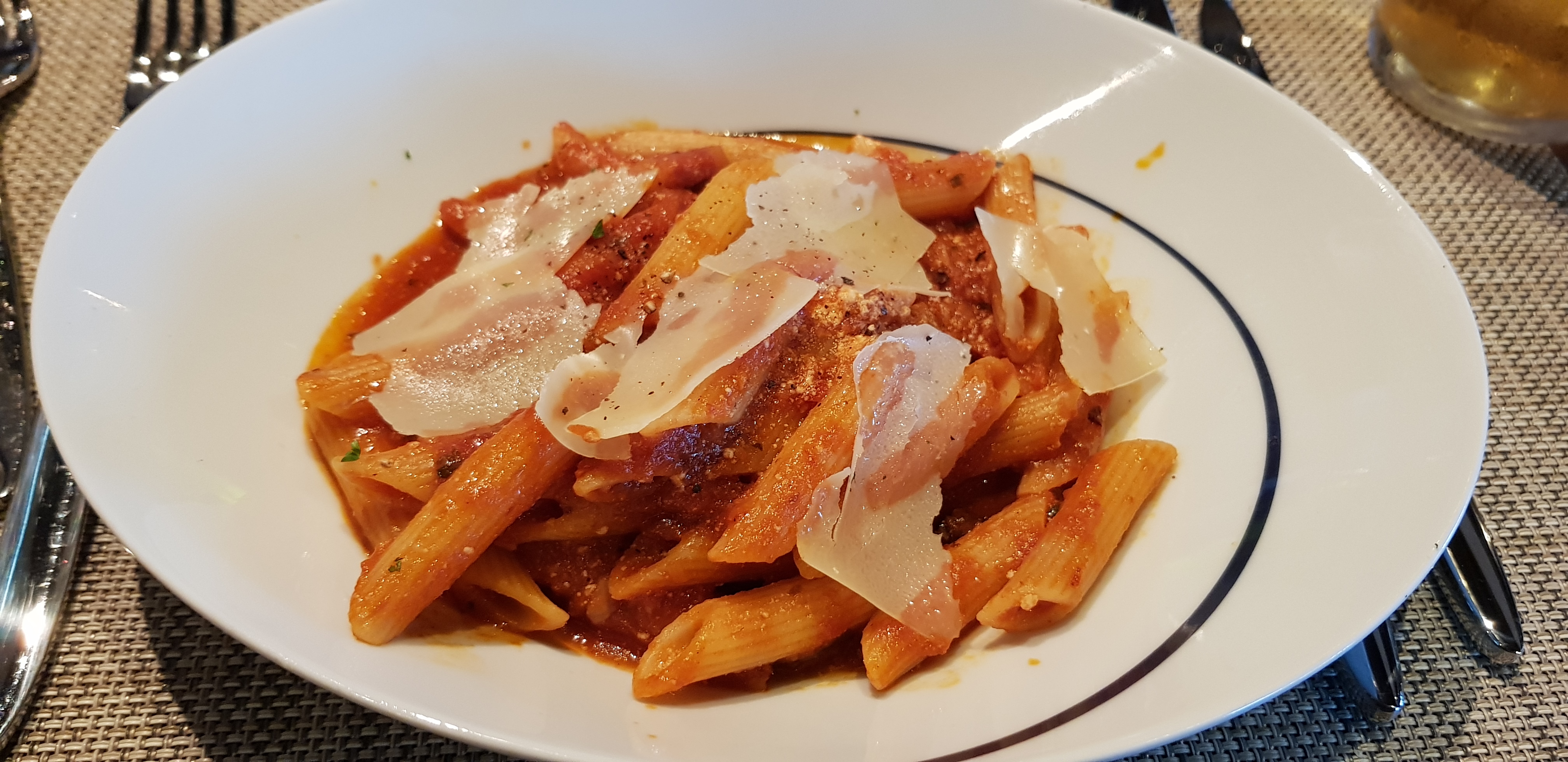 So we ordered a pasta dish each as an appetizer (no antipasti thank you!) – Spaghetti Carbonara Classica for me and Pasta Amatriciana for Chris.