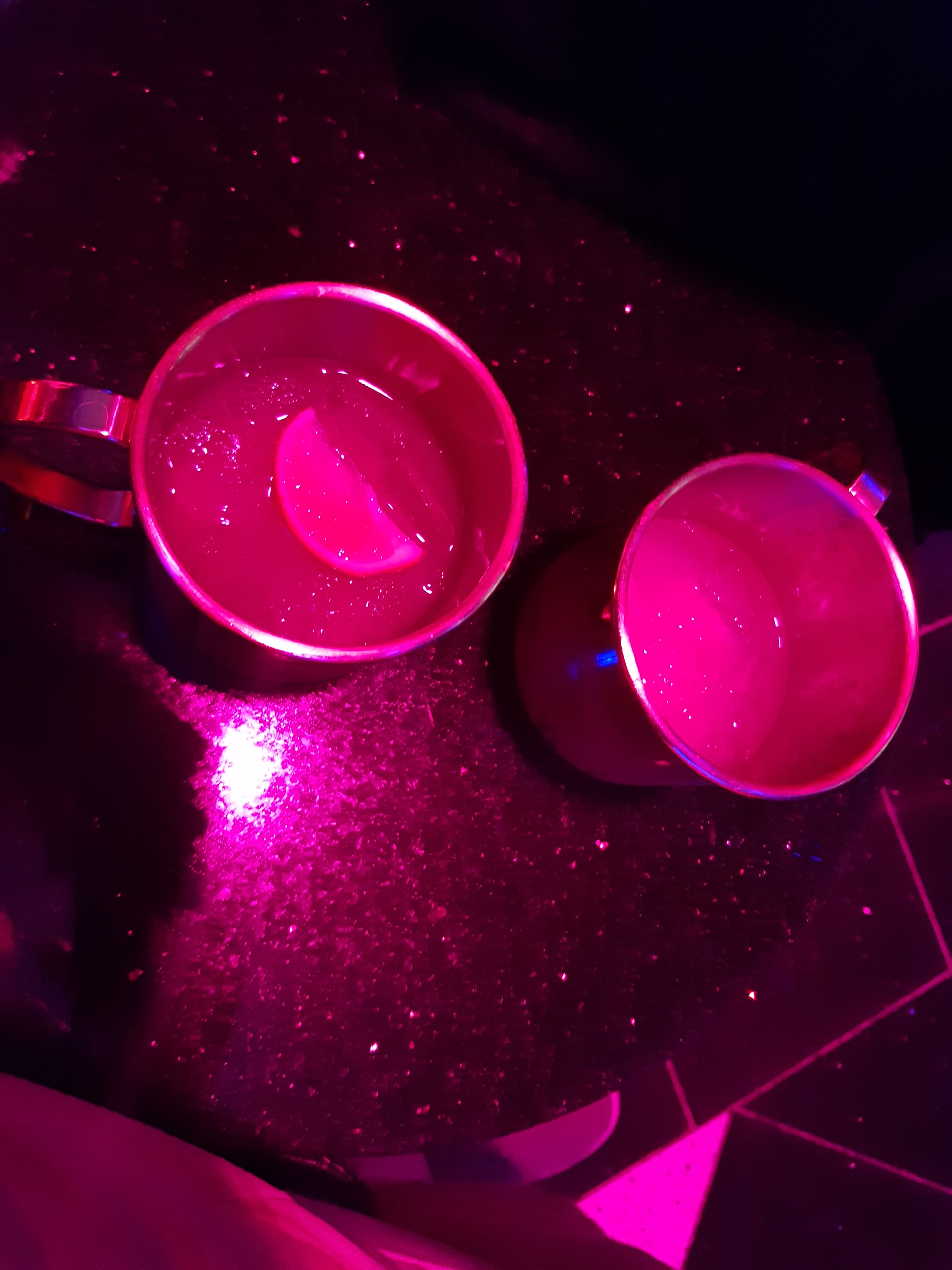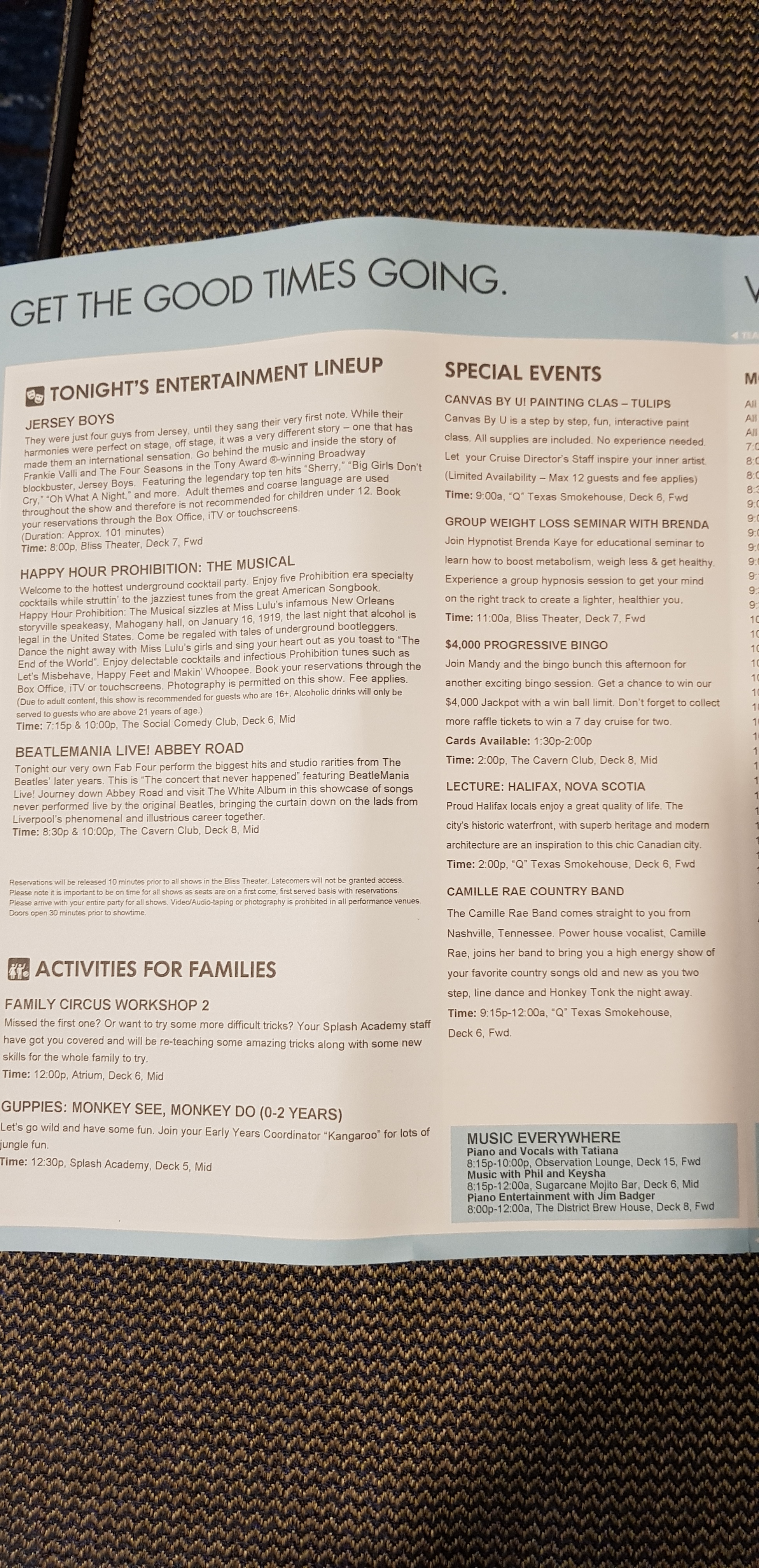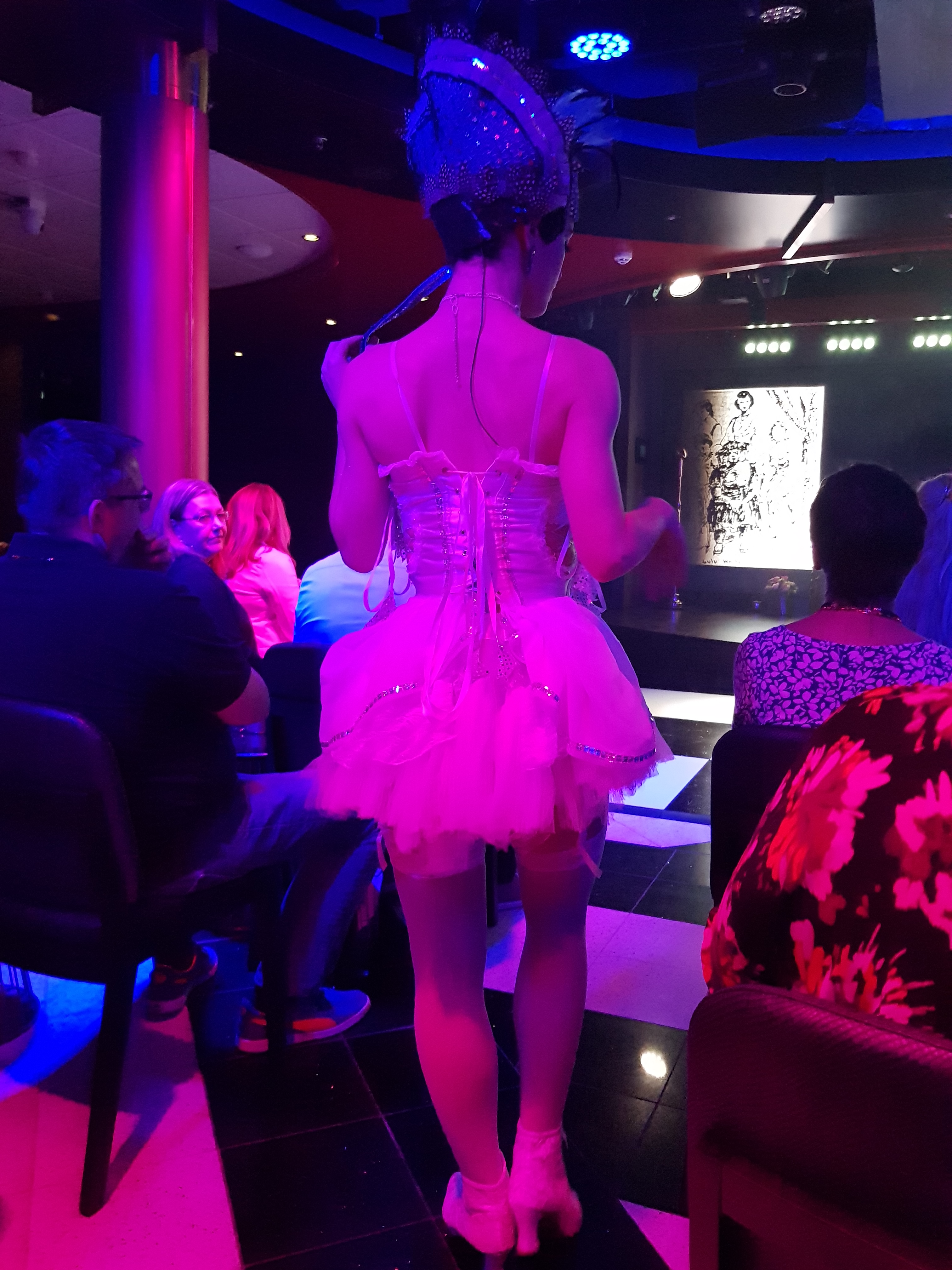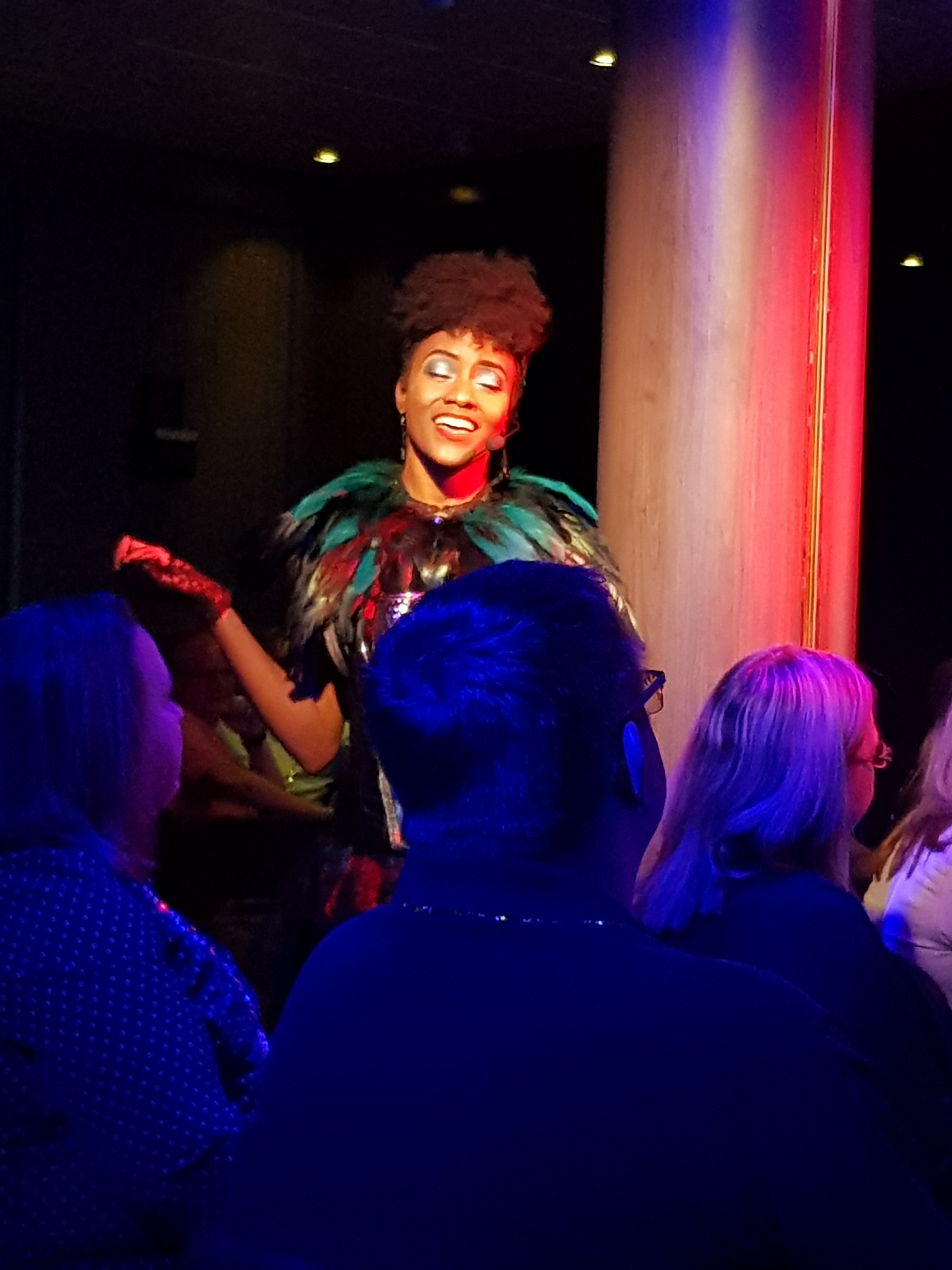 We went back to the room to change for the Happy Hour Prohibition show at 10pm. This was held in The Social – one of our favourite venues on the ship. There was a queue to get in by 9:30pm at least and they started scanning cards to let us in early. We were then given long silver beads to wear a cocktail in a tin cup and a foldable menu of drinks. We were then asked to choose pairs of seats set up in front of the stage around their own little drinks table.
